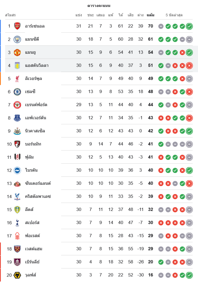 สถานการณ์ในตารางคะแนนพรีเมียร์ลีก อังกฤษ