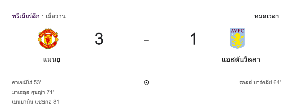 - ⚽ นาที 81 เบนยามิน เชสโก้ ยิงให้แมนยูไนเต็ดหนี 3-1