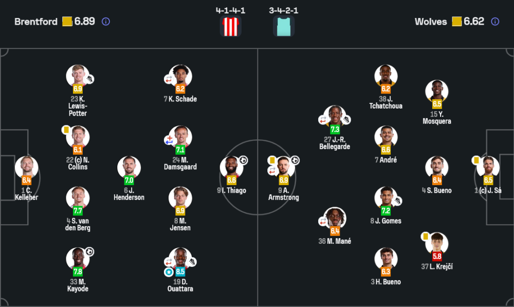 แม้เบรนท์ฟอร์ดจะไม่ชนะ แต่ ด็องโก้ อูอัตตาร่า คือผู้เล่นที่โดดเด่นที่สุดในสนามด้วยคะแนน 8.5 เขามีส่วนกับเกมรุกแทบทุกจังหวะอันตราย ทั้งการลากบอล การสร้างพื้นที่ และแอสซิสต์ให้ธิอาโก้ยิงประตู 2-0