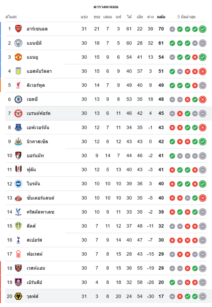 สถานการณ์ในตารางคะแนนพรีเมียร์ลีก อังกฤษ