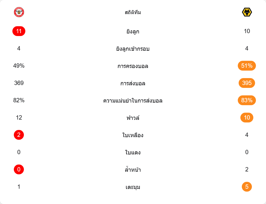 ด้านลูกนิ่ง วูล์ฟส์ได้เตะมุมมากกว่าชัดเจน 5 ต่อ 1 และจุดนี้กลายเป็นอาวุธสำคัญในครึ่งหลัง การจ่ายบอลทั้งสองทีมใกล้เคียงกันมาก โดยเบรนท์ฟอร์ดจ่าย 416 ครั้ง ส่วนวูล์ฟส์ 418 ครั้ง ขณะที่เรื่องใบเหลือง วูล์ฟส์โดน 4 ใบ มากกว่าเบรนท์ฟอร์ดที่โดน 2 ใบ