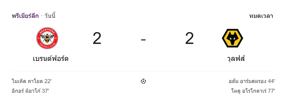 เกม พรีเมียร์ลีก อังกฤษ คู่นี้จบแบบคนดู ผลบอลสด ได้อารมณ์เต็ม ๆ เมื่อ เบรนท์ฟอร์ดออกนำก่อนถึง 2 ประตู แต่สุดท้ายโดนวูล์ฟแฮมป์ตันไล่ตีเสมอ 2-2 ชนิดที่เจ้าถิ่นต้องมีเสียดาย เพราะรูปเกมช่วงต้นพวกเขาเหนือกว่าชัดเจน แต่ครึ่งหลังกลับคุมความได้เปรียบไว้ไม่อยู่