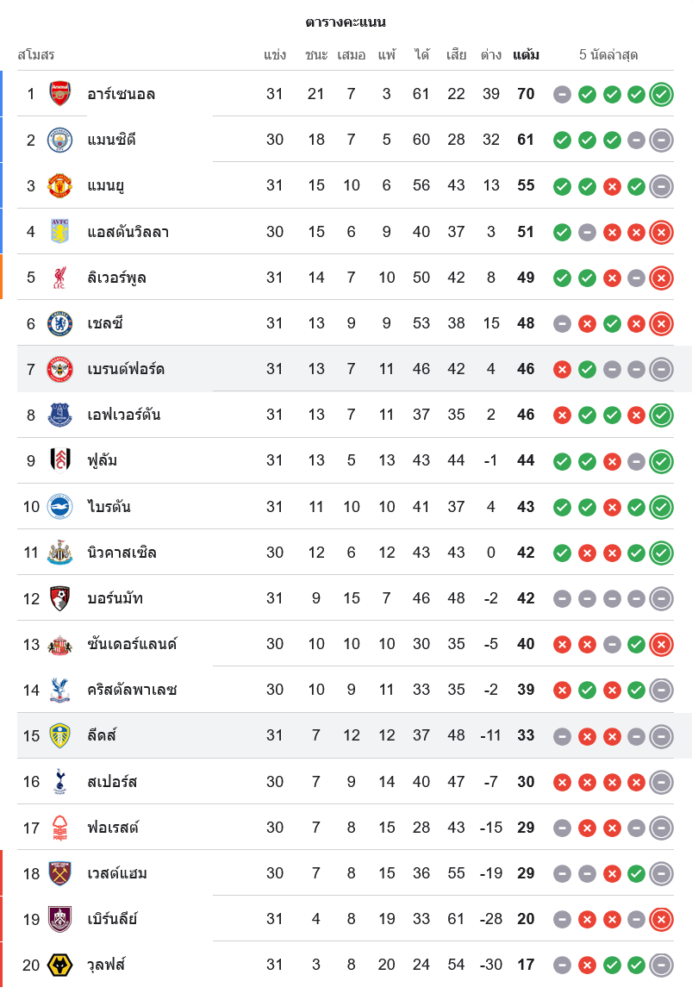 สถานการณ์ในตารางคะแนนพรีเมียร์ลีก อังกฤษ