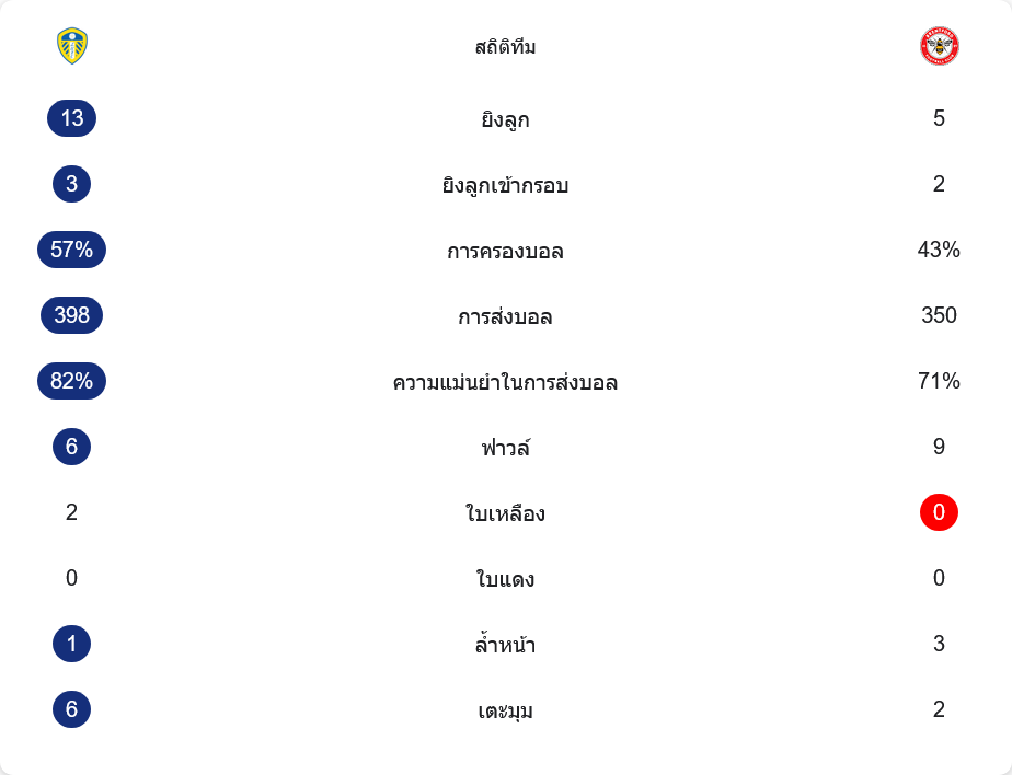 - 🛑 หมดเวลา ลีดส์ ยูไนเต็ด เสมอ เบรนท์ฟอร์ด 0-0