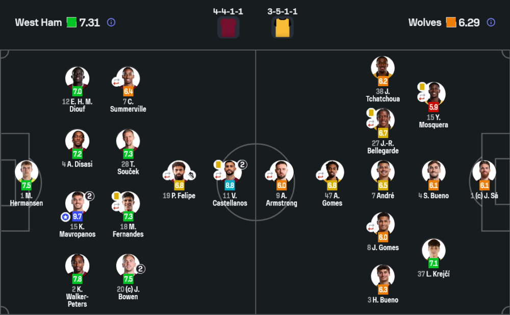 เวสต์แฮมมาในระบบ 4-4-1-1 และเล่นได้ตรงจุดมาก เจ้าถิ่นไม่ได้เน้นครองบอลสวยงาม แต่ใช้เกมรุกที่ตรงและเร็ว เล่นงานพื้นที่ระหว่างแนวรับกับวิงแบ็กของวูล์ฟส์ได้ต่อเนื่อง โบเวนกับซัมเมอร์วิลล์ช่วยเปิดพื้นที่ด้านข้าง ขณะที่ปาโบลคอยเชื่อมเกมให้กาสเตยานอสจบสกอร์ในเขตโทษ