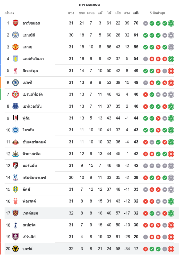 สถานการณ์ในตารางคะแนนพรีเมียร์ลีก อังกฤษ
