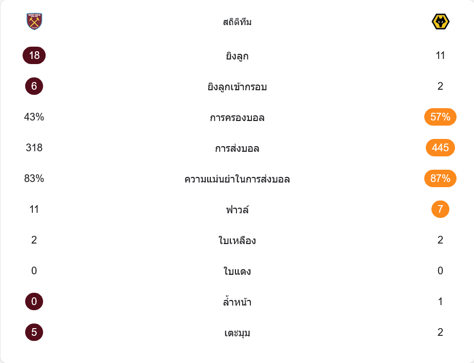 แม้วูล์ฟส์จะครองบอลมากกว่าที่ 57 เปอร์เซ็นต์ และผ่านบอล 445 ครั้งด้วยความแม่นยำ 87 เปอร์เซ็นต์ แต่เวสต์แฮมอันตรายกว่าชัดเจนจากการยิง 18 ครั้ง เข้ากรอบ 6 หน ขณะที่ทีมเยือนยิง 11 ครั้ง เข้ากรอบเพียง 2 ครั้ง เจ้าบ้านยังได้เตะมุมมากกว่า 5 ต่อ 2 และใช้โอกาสจากลูกนิ่งได้คมมาก เกมนี้จึงชัดเจนว่าเวสต์แฮมเหนือกว่าทั้งคุณภาพการเข้าทำและความเด็ดขาดในจังหวะสำคัญ