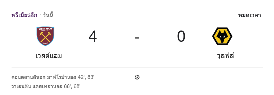 ครึ่งหลัง เวสต์แฮมเล่นได้เฉียบคมกว่าเดิมอย่างชัดเจน นาที 66 วาเลนติน กาสเตยานอสยิงให้หนี 2-0 ก่อนซัดอีกลูกในนาที 68 เป็น 3-0 แบบเด็ดขาด วูล์ฟส์พยายามเปลี่ยนตัวแก้เกม แต่จังหวะรุกยังขาดความคม สุดท้ายนาที 83 มาฟโรปานอสเติมขึ้นมายิงลูกที่สองของตัวเอง ปิดเกมให้เจ้าบ้านชนะ 4-0 แบบไม่ต้องลุ้น