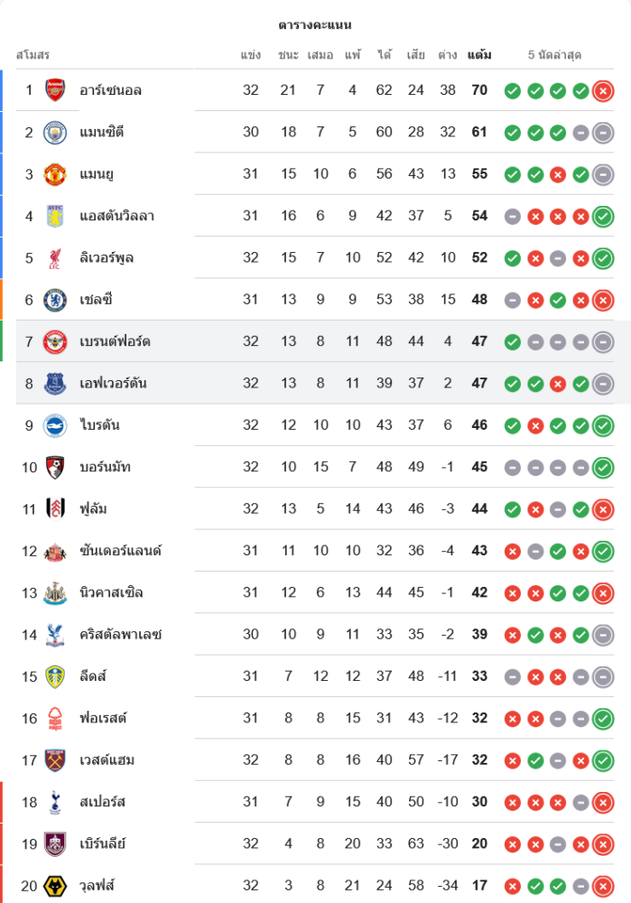 สถานการณ์ในตารางคะแนนพรีเมียร์ลีก อังกฤษ