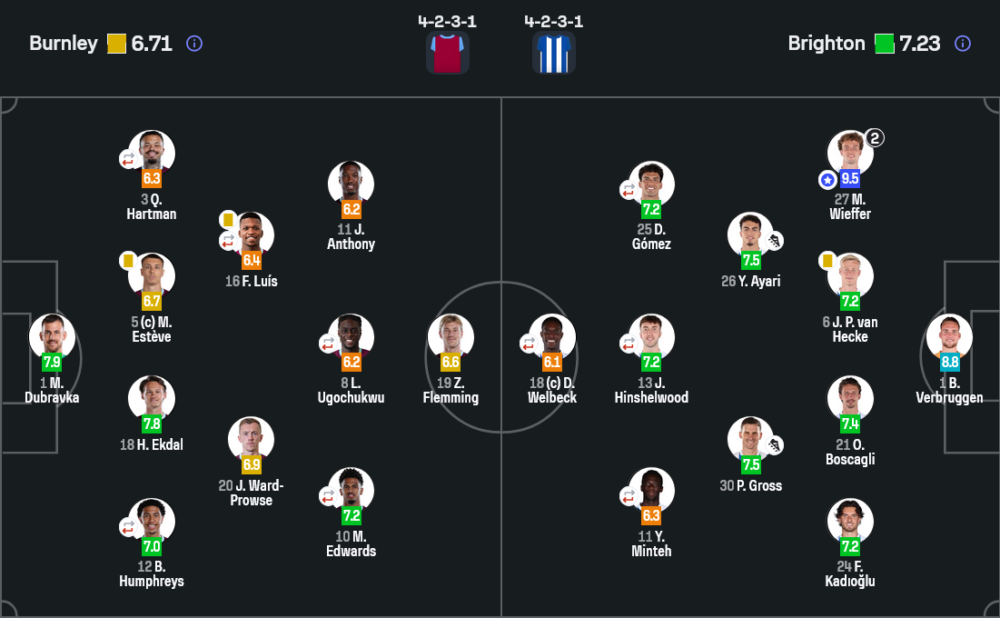• กองกลาง : แจ็ค ฮินเชลวูด 7.2 , ปาสกาล กรอสส์ 7.5 , ยาซิน อายารี 7.5