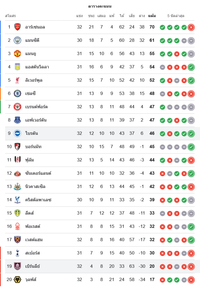 สถานการณ์ในตารางคะแนนพรีเมียร์ลีก อังกฤษ
