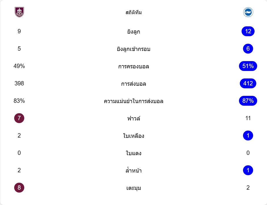 ภาพรวมเกมถือว่าสูสีพอตัว ไบรท์ตันยิง 12 ครั้ง เข้ากรอบ 6 ส่วนเบิร์นลีย์ยิง 9 ครั้ง เข้ากรอบ 5 การครองบอลใกล้เคียงกันที่ 51 เปอร์เซ็นต์ต่อ 49 เปอร์เซ็นต์ ทีมเยือนจ่ายบอล 412 ครั้งแม่น 87 เปอร์เซ็นต์ ดีกว่าเบิร์นลีย์ที่จ่าย 398 ครั้งแม่น 83 เปอร์เซ็นต์ ขณะที่เจ้าบ้านได้เตะมุมมากถึง 8 ครั้ง เทียบกับไบรท์ตัน 2 ครั้ง แต่ความเฉียบคมในพื้นที่สุดท้ายเป็นฝั่งไบรท์ตันที่ชัดเจนกว่า