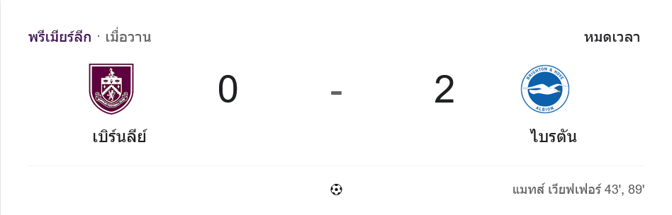 ไบรท์ตันเองก็ไม่ได้ถอยอย่างเดียว พวกเขามีจังหวะสวนและต่อบอลเข้าทำได้อันตรายหลายครั้ง ก่อนปิดเกมในนาที 89 จาก วีฟเฟอร์ คนเดิมที่รับบอลจาก ยาซิน อายารี แล้วซัดไกลเสียบมุมอย่างเด็ดขาด เป็นประตู 2-0 ที่ตอกฝาโลงเบิร์นลีย์แบบเจ็บแสบ และพาทีมเยือนเก็บสามแต้มเต็ม