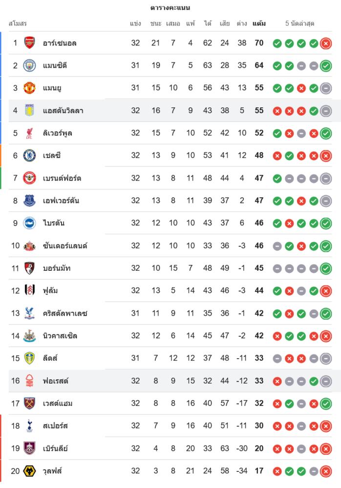 สถานการณ์ในตารางคะแนนพรีเมียร์ลีก อังกฤษ