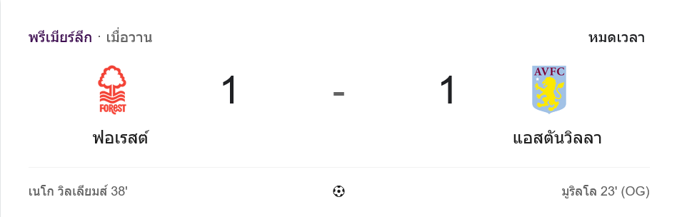 ศึก พรีเมียร์ลีก อังกฤษ คู่นี้จบลงแบบดุเดือดที่สกอร์ 1-1 หลังทั้งสองทีมเปิดเกมแลกกันสนุกตั้งแต่นาทีแรก ฟอเรสต์เริ่มต้นได้คึกคักกว่าและสร้างแรงกดดันได้ต่อเนื่อง ขณะที่แอสตัน วิลล่าอาศัยจังหวะสวนกลับและความเฉียบคมเล่นงานเจ้าถิ่นได้เป็นระยะ ทำให้แฟน ผลบอลสด ต้องลุ้นกันตลอดทั้งเกม