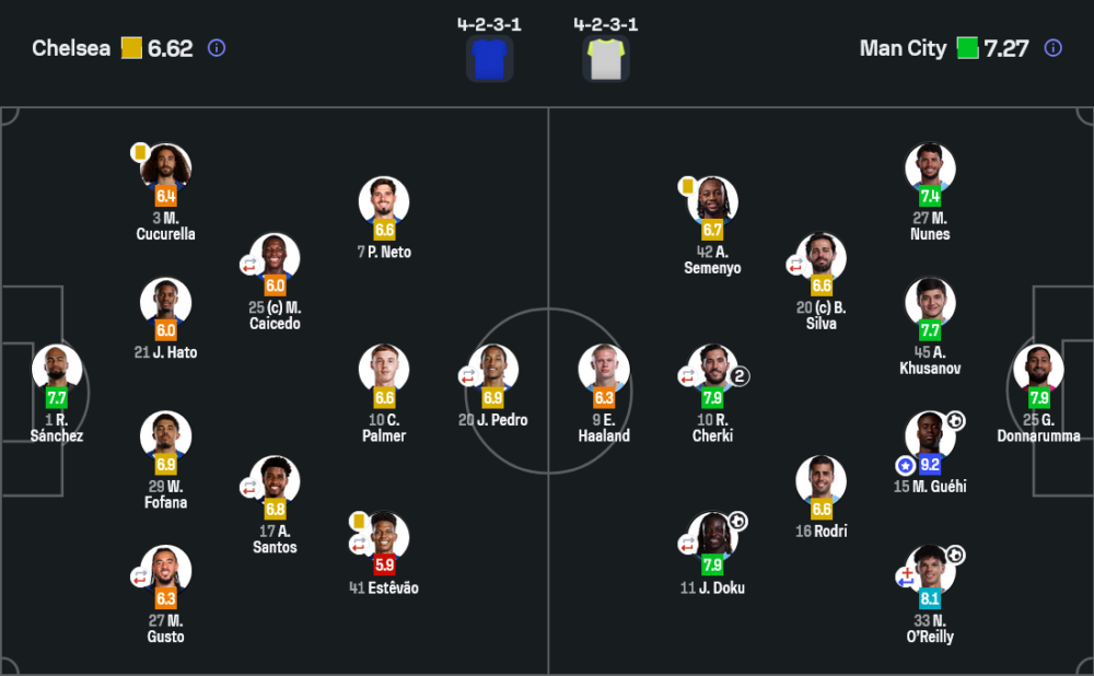 หลังจากนั้นเชลซีพยายามฮึดคืนจาก ชูเอา เปโดร, กูกูเรญา และ พาลเมอร์ แต่ จานลุยจิ ดอนนารุมมา ยังยืนระยะเซฟได้ดี ทำให้จบเกมแบบหมดข้อแก้ตัวสำหรับเจ้าถิ่น ขณะที่แมนฯ ซิตี้เก็บ 3 แต้มด้วยฟอร์มที่ทั้งแน่นและคมกว่าอย่างชัดเจน