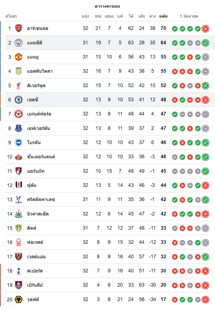 สถานการณ์ในตารางคะแนนพรีเมียร์ลีก อังกฤษ