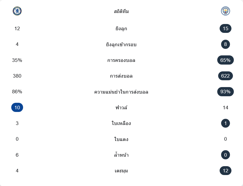 ส่วนเชลซีมีปัญหาทั้งในเกมรับลูกนิ่ง การยืนตำแหน่งในกรอบเขตโทษ และการเปลี่ยนจากรับเป็นรุก แม้จะมีโอกาสยิงอยู่บ้าง แต่ส่วนใหญ่จบไม่คมหรือโดนบีบเร็วเกินไป ต่างจากซิตี้ที่พอได้ช่องก็พร้อมลงโทษทันที นี่คือความต่างของทีมที่เล่นเป็นระบบและเฉียบขาดกว่าอย่างแท้จริง