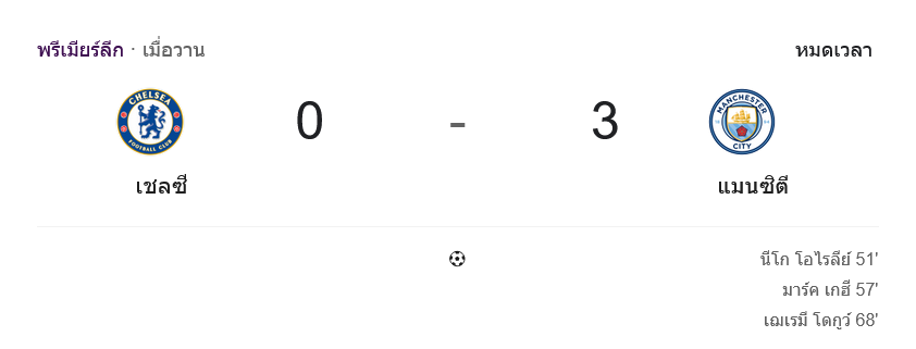 ศึก พรีเมียร์ลีก อังกฤษ คู่นี้จบลงแบบชัดเจน เมื่อ แมนเชสเตอร์ ซิตี้ บุกมาถล่ม เชลซี 3-0 ถึงบ้านจากคุณภาพเกมรุกที่เฉียบกว่าและการเข้าทำที่เด็ดขาดกว่า ตลอดเกมเจ้าบ้านพอมีช่วงบุกและสร้างโอกาสได้บ้าง แต่สุดท้ายเปลี่ยนเป็นประตูไม่ได้ ขณะที่ทีมเยือนลงโทษทุกความผิดพลาดอย่างเลือดเย็น เป็นอีกเกม ผลบอลสด ที่สะท้อนชัดว่าเชลซียังมีจุดต้องแก้อีกมาก หากหวังจะยืนระยะกับทีมระดับลุ้นแชมป์