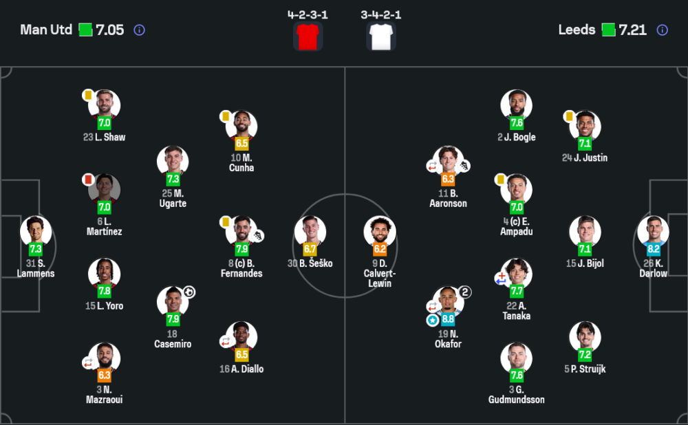 แมนยูมาในระบบ 4-2-3-1 เน้นครองบอลและต่อเกมผ่านแดนกลาง โดยมีบรูโน่เป็นตัวเชื่อมเกมรุก ส่วนคาเซมิโร่กับอูการ์เต้คอยประคองสมดุล แต่ปัญหาคือจังหวะรับเปลี่ยนเป็นรุกยังช้าเกินไป ทำให้ลีดส์เจาะพื้นที่ด้านข้างและครึ่งช่องได้หลายครั้ง โดยเฉพาะการเคลื่อนที่ของโอคาฟอร์ที่สร้างความเสียหายชัดเจน