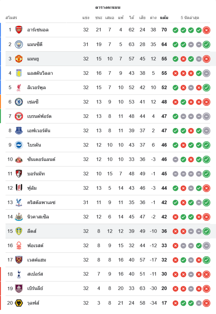 สถานการณ์ในตารางคะแนนพรีเมียร์ลีก อังกฤษ