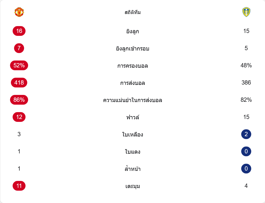แมนยูครองบอล 52 เปอร์เซ็นต์ เหนือลีดส์ที่มี 48 เปอร์เซ็นต์ และยิงรวม 16 ครั้ง เข้ากรอบ 7 ครั้ง ส่วนลีดส์ยิง 15 ครั้ง เข้ากรอบ 5 ครั้ง เจ้าถิ่นผ่านบอล 418 ครั้งแม่นยำ 86 เปอร์เซ็นต์ ขณะที่ทีมเยือนผ่านบอล 386 ครั้งแม่นยำ 82 เปอร์เซ็นต์ แมนยูได้เตะมุมมากถึง 11 ครั้ง ส่วนลีดส์ได้ 4 ครั้ง แต่สิ่งที่ต่างกันชัดคือความเฉียบคมของทีมเยือนที่เปลี่ยนโอกาสสำคัญเป็นสองประตูตั้งแต่ครึ่งแรก ขณะที่เกมนี้แมนยูมี 3 ใบเหลืองและ 1 ใบแดง ส่วนลีดส์โดน 2 ใบเหลือง