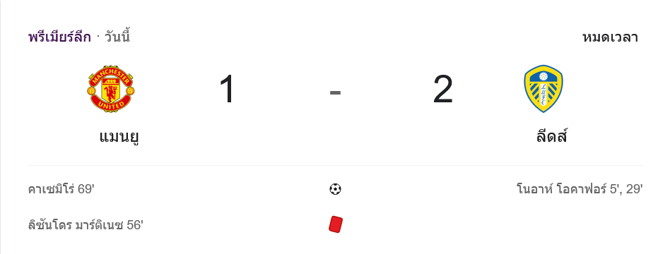 ช่วงท้ายเกมแมนยูมีโอกาสลุ้นหลายครั้ง ทั้งจากคุนญ่า เซสโก้ และลูกเตะมุมต่อเนื่อง แต่ดาร์โลว์กับแนวรับลีดส์ยังต้านอยู่ สุดท้ายหมดเวลา ลีดส์บุกคว้าชัย 2-1 แบบมีวินัยและเด็ดขาดกว่า