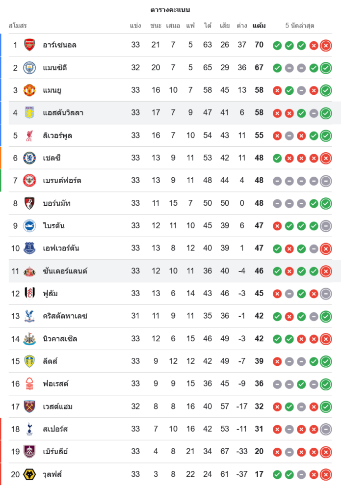 สถานการณ์ในตารางคะแนนพรีเมียร์ลีก อังกฤษ