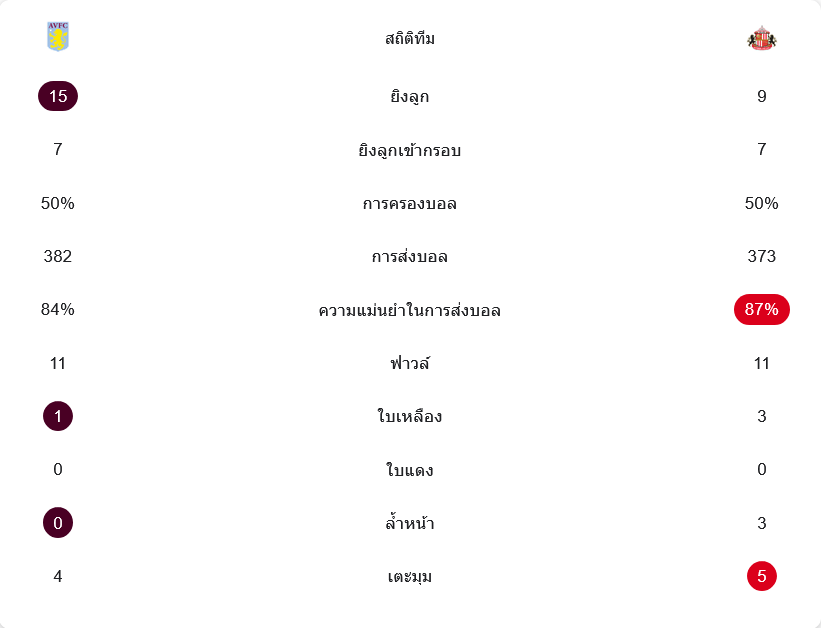 แม้สกอร์จะออกมา 4-3 แต่รูปเกมถือว่าสูสี วิลล่ายิง 15 ครั้ง เข้ากรอบ 7 ครั้ง ส่วนซันเดอร์แลนด์ยิง 9 ครั้ง เข้ากรอบ 7 ครั้งเช่นกัน ทั้งสองทีมครองบอลเท่ากันที่ 50 เปอร์เซ็นต์ วิลล่าจ่ายบอล 382 ครั้ง แม่นยำ 84 เปอร์เซ็นต์ ส่วนซันเดอร์แลนด์จ่าย 373 ครั้ง แม่นยำ 87 เปอร์เซ็นต์ ทีมเยือนได้เตะมุม 5 ครั้ง มากกว่าวิลล่าที่ได้ 4 ครั้งเล็กน้อย ภาพรวมจึงเป็นเกมที่ไม่ได้ขาดกันในเชิงตัวเลข แต่เจ้าบ้านคมกว่าในจังหวะชี้ขาด