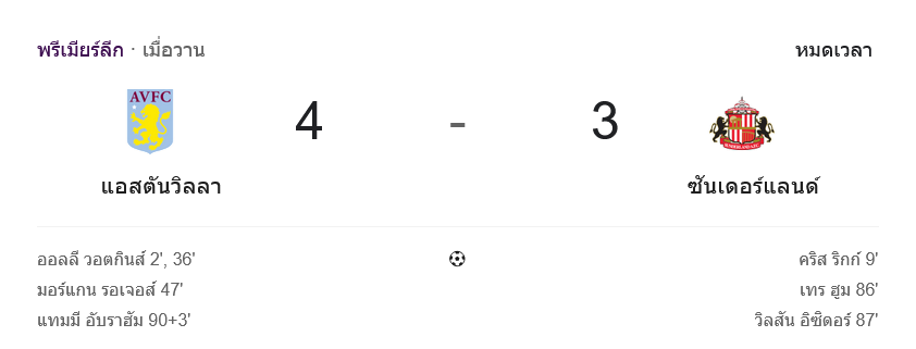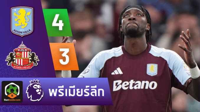 ศึก พรีเมียร์ลีก อังกฤษ คู่นี้มันตั้งแต่นาทีแรกจนวินาทีสุดท้าย และคำว่า ผลบอลสด ของเกมนี้เปลี่ยนอารมณ์แทบทุกช่วง สุดท้าย แอสตัน วิลล่า เปิดบ้านเฉือน ซันเดอร์แลนด์ 4-3 ในเกมที่เจ้าถิ่นเกือบปิดงานได้ตั้งแต่ต้นครึ่งหลัง แต่ดันปล่อยให้คู่แข่งฮึดกลับมา ก่อนมาเอาประตูชัยช่วงทดเวลาแบบสะใจทั้งสนาม