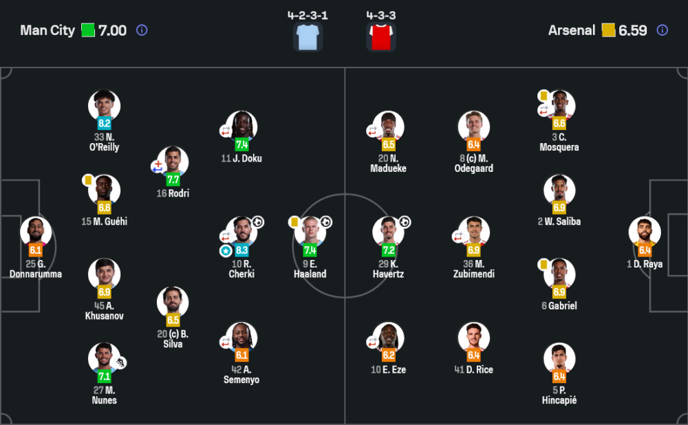 แมนซิตี้มาในระบบ 4-2-3-1 ที่เล่นยืดหยุ่นมาก โดยมี โรดรี คุมจังหวะกลางสนาม และ แชร์กี้ เป็นตัวเชื่อมเกมรุก ส่วน โดกู กับ โอไรลลี ช่วยดึงแนวรับอาร์เซนอลให้เปิดช่องตรงกลาง จน ฮาลันด์ ได้พื้นที่เล่นในกรอบเขตโทษมากขึ้น