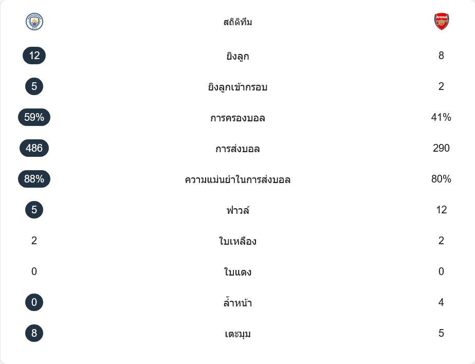 แมนซิตี้เหนือกว่าชัดในภาพรวม พวกเขายิง 12 ครั้ง เข้ากรอบ 5 ครั้ง ครองบอล 59 เปอร์เซ็นต์ และผ่านบอล 486 ครั้งด้วยความแม่นยำ 88 เปอร์เซ็นต์ ส่วนอาร์เซนอลยิง 8 ครั้ง เข้ากรอบ 2 ครั้ง ครองบอล 41 เปอร์เซ็นต์ และผ่านบอล 290 ครั้ง ความแม่นยำ 80 เปอร์เซ็นต์ เจ้าบ้านได้เตะมุม 8 ครั้ง มากกว่าทีมเยือนที่ได้ 5 ครั้ง ขณะที่อาร์เซนอลฟาวล์มากกว่าชัดเจนที่ 12 ครั้ง เทียบกับแมนซิตี้ 5 ครั้ง สถิติเหล่านี้สะท้อนว่าเจ้าบ้านคุมเกมและสร้างแรงกดดันได้ต่อเนื่องกว่า