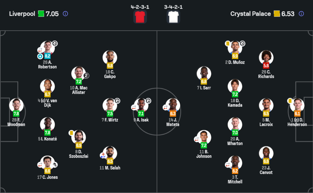 - กองกลาง : โดมินิก โซบอสไล 6.9, อเล็กซิส แม็ค อัลลิสเตอร์ 7.2, ฟลอเรียน เวียร์ตซ์ 7.5