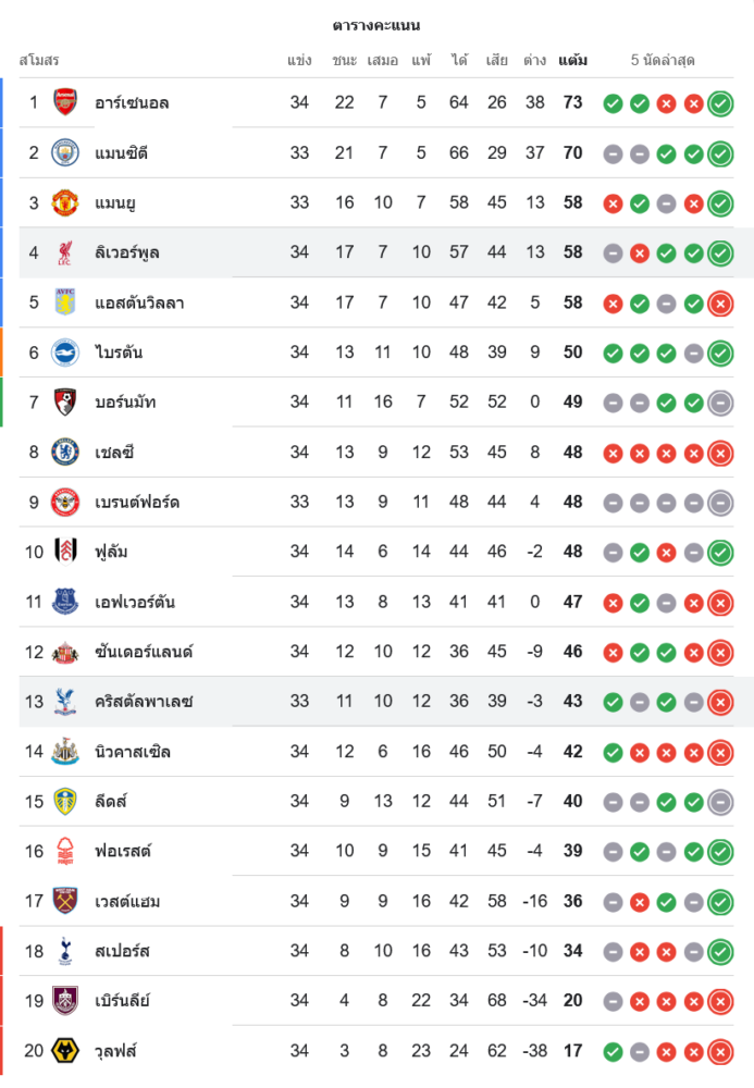 สถานการณ์ในตารางคะแนนพรีเมียร์ลีก อังกฤษ