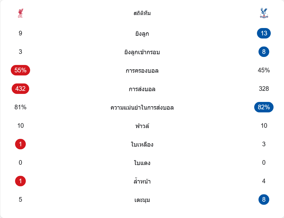 ลิเวอร์พูลยิง 9 ครั้ง เข้ากรอบ 3 ครั้ง ครองบอล 55% ส่งบอล 432 ครั้ง ความแม่นยำ 81% ได้เตะมุม 5 ครั้ง ส่วนคริสตัล พาเลซยิง 13 ครั้ง เข้ากรอบ 8 ครั้ง ครองบอล 45% ส่งบอล 328 ครั้ง ความแม่นยำ 82% และได้เตะมุม 8 ครั้ง ตัวเลขสะท้อนชัดว่าพาเลซมีโอกาสเยอะ แต่ลิเวอร์พูลคมกว่า และมีวู้ดแมนคอยเซฟจังหวะสำคัญ