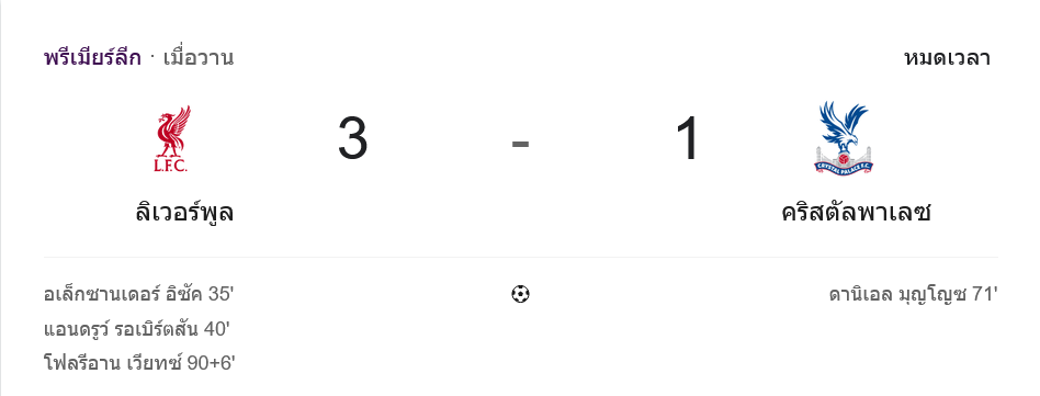จาก : ผลบอลสด พรีเมียร์ลีก อังกฤษ ระหว่าง ลิเวอร์พูล 3-1 คริสตัล พาเลซ วันนี้ 25/4/69 – บ้านกีฬา