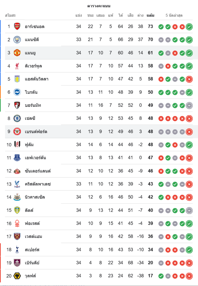 สถานการณ์ในตารางคะแนนพรีเมียร์ลีก อังกฤษ