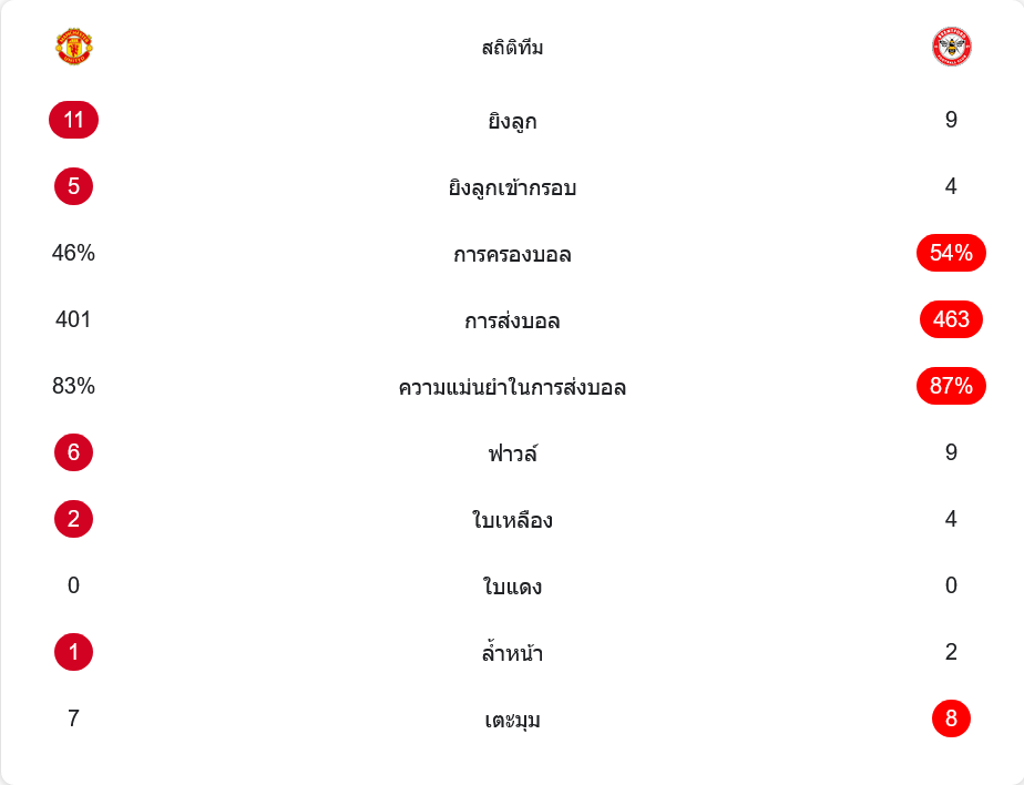 เกมนี้เบรนท์ฟอร์ดครองบอลมากกว่า 54% และผ่านบอล 463 ครั้ง แม่นยำ 87% เหนือกว่าแมนยูที่ครองบอล 46% ผ่านบอล 401 ครั้ง แม่นยำ 83% แต่แมนยูยิงมากกว่า 11 ครั้ง เข้ากรอบ 5 ครั้ง และได้ประตูจากโอกาสสำคัญ ขณะที่เบรนท์ฟอร์ดยิง 9 ครั้ง เข้ากรอบ 4 ครั้ง ฟาวล์รวมฝั่งละหนักพอสมควร แมนยูฟาวล์ 6 ครั้ง เบรนท์ฟอร์ด 9 ครั้ง ส่วนเตะมุมทีมเยือนได้มากกว่า 8 ต่อ 7 สะท้อนชัดว่าท้ายเกมเบรนท์ฟอร์ดกดดันหนัก แต่เจาะไม่ขาด
