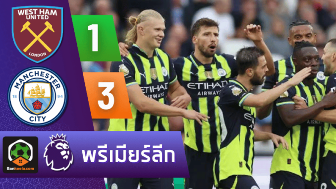 การแข่งขันฟุตบอลพรีเมียร์ลีก 2024 นัดนี้จบลงด้วยชัยชนะของ แมนเชสเตอร์ ซิตี้ ที่บุกมาเอาชนะ เวสต์แฮมยูไนเต็ด ไปได้ด้วยสกอร์ 3-1 ที่สนามลอนดอน สเตเดียม การแข่งขันเริ่มต้นขึ้นอย่างรวดเร็วและเข้มข้น โดยแมนเชสเตอร์ ซิตี้ สามารถขึ้นนำได้อย่างรวดเร็วในนาทีที่ 10 จากการยิงของ เออร์ลิง โฮลันด์ ที่ทำให้ทีมเยือนได้เปรียบตั้งแต่ต้นเกม