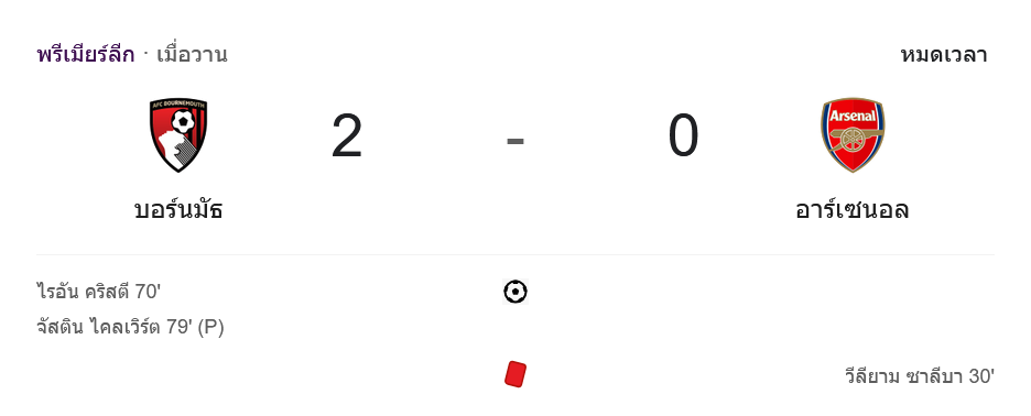 ในการแข่งขัน พรีเมียร์ลีก 2024 เมื่อคืนที่ผ่านมา บอร์นมัธ เอเอฟซี โชว์ฟอร์มสุดแกร่ง เปิดบ้านเอาชนะ อาร์เซนอล ไปด้วยสกอร์ 2-0 โดยมีประตูจาก ไรอัน คริสตี้ และ จัสติน ไคลเวิร์ต ช่วยกันส่งให้ปืนใหญ่ต้องกลับบ้านมือเปล่า อีกทั้ง วิลเลียม ซาลิบา ของอาร์เซนอลถูกใบแดงไล่ออกตั้งแต่ครึ่งแรก ทำให้เกมของอาร์เซนอลเป็นไปอย่างยากลำบาก