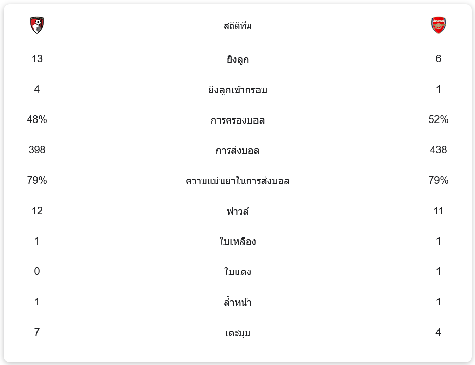 บอร์นมัธ มีโอกาสยิงทั้งหมด 13 ครั้ง เข้ากรอบ 4 ครั้ง ขณะที่อาร์เซนอล มีโอกาสยิงเพียง 6 ครั้ง เข้ากรอบเพียง 1 ครั้ง แม้ว่าอาร์เซนอลจะครองบอลมากกว่าเล็กน้อยที่ 52% เทียบกับบอร์นมัธที่ 48% แต่การเล่นด้วยผู้เล่น 10 คนส่งผลให้ทีมเยือนไม่สามารถสร้างความอันตรายได้อย่างที่ควร นอกจากนี้ การส่งบอลของทั้งสองทีมมีความแม่นยำเท่ากันที่ 79%