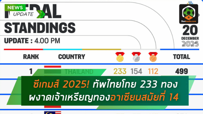 ความโหดของผลงานไทยในครั้งนี้ ไม่ได้หยุดอยู่แค่การคว้าอันดับ 1 บนตารางเหรียญ แต่ยังเป็นการ ทำลายสถิติตลอดกาลของกีฬาซีเกมส์ ที่ เวียดนาม เคยสร้างไว้ที่ 205 เหรียญทอง ในปี 2021 อีกด้วย