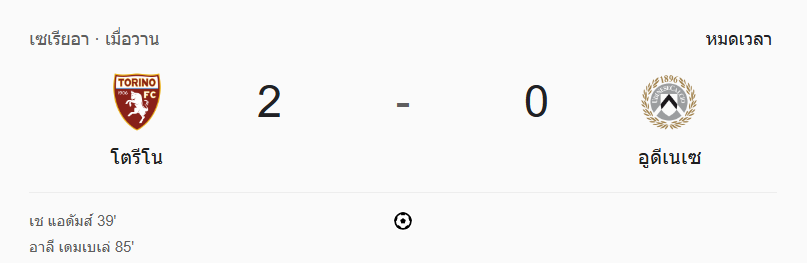 เกมนี้ โตริโน่ โชว์ให้เห็นถึงความแน่นอนในทุกจังหวะ ทั้งเกมรุกและเกมรับ โดยเฉพาะฟอร์มของ เช อดัมส์ และ อาลี เดมเบเล่ ที่ซัดกันคนละประตูส่งให้ ผลบอลสด จบลงด้วยชัยชนะสุดแกร่ง ขณะที่ อูดิเนเซ่ พยายามเต็มที่แต่ยังไม่พอจะเจาะแนวรับเจ้าถิ่นในค่ำคืนนี้!