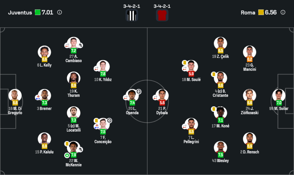 ฝั่งโรม่า ภายใต้การคุมทีมของ จาน ปิเอโร กาสเปรินี่ ยังคงเอกลักษณ์บอลเพรสซิ่งและการยืนโซนสูง ไล่ตั้งแต่แนวหน้า ดิบาล่า–ซูเล่ บังคับให้ยูเว่ต้องเตะยาวตลอด แต่ปัญหาคือเกมด้านในของโรม่าขาดตัวทะลุช่องจริงๆ เมื่อดิบาล่าโดนตามติด แนวรุกจึงต้องหันไปเปิดบอลจากด้านข้างให้ เฟอร์กูสัน หรือ บัลดันซี่ เสียบเสาไกลแทน ซึ่งต้องแลกด้วยการดันวิงแบ็กขึ้นสูงจนแนวรับหลังสามเปิดพื้นที่ด้านหลังกองหลัง ทำให้ลูก 2-0 ที่โอเปนดายิงเกิดจากจังหวะที่แนวรับโรม่าถอยไม่ทันปล่อยให้แม็คเคนนี่ครอสสบายๆ