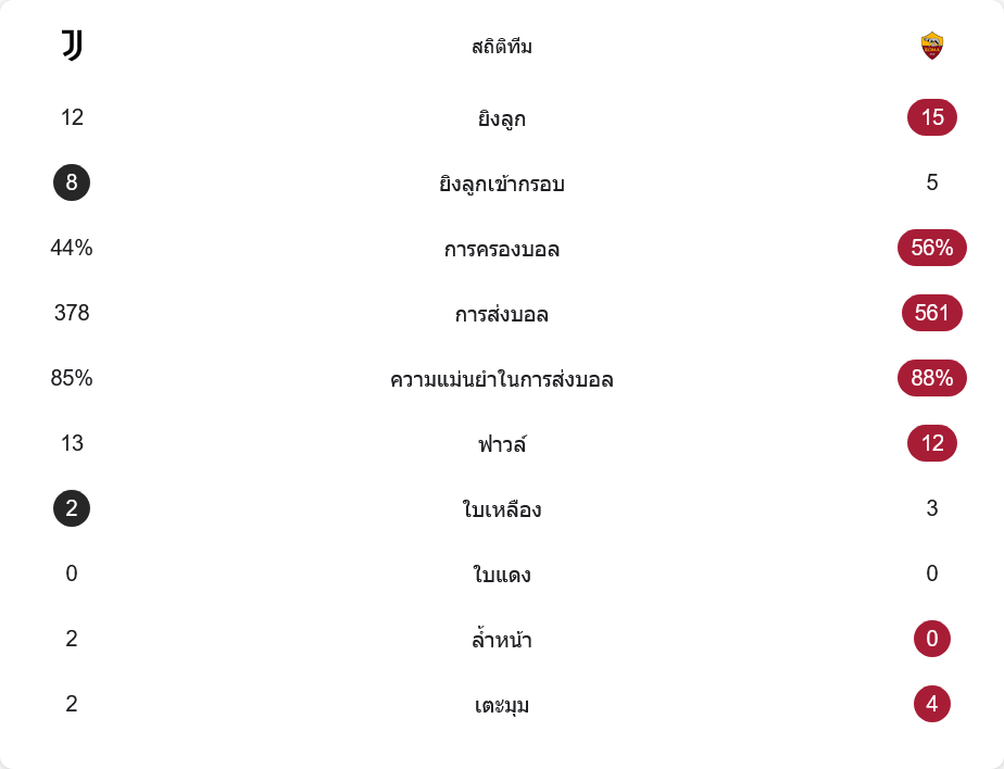 แม้ตัวเลขจะชี้ชัดว่าโรม่าเป็นฝ่ายครองบอลมากกว่าด้วยสัดส่วน 56% ต่อ 44% และผ่านบอลได้ถึง 561 ครั้ง เทียบกับ 378 ครั้งของยูเว่ พร้อมอัตราจ่ายบอลสำเร็จ 88% ต่อ 85% แต่สิ่งที่ชี้ขาดคือคุณภาพในพื้นที่สุดท้าย ยูเวนตุสยิงทั้งหมด 12 ครั้ง เข้ากรอบ 8 ครั้ง ขณะที่โรม่ายิงมากกว่าที่ 15 ครั้ง แต่หลุดกรอบไปถึง 10 ลูก เข้ากรอบเพียง 5 ครั้งเท่านั้น