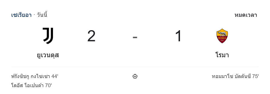 • ⏱️ ทดเวลาบาดเจ็บ 5 นาที โรม่าบุกหนักแต่เจาะไม่เข้า จบเกมยูเวนตุสชนะ 2-1