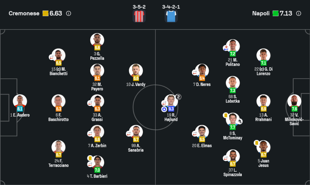 ราสมุส ฮอยลุนด์ สมควรอย่างยิ่งกับรางวัล Man of the Match ด้วยเรตติ้งสูงถึง 9.3 หัวหอกนาโปลีอ่านไลน์กองหลังคู่แข่งได้เฉียบขาด วิ่งหาช่องตลอดเวลา ใช้จังหวะจบสกอร์ไม่เปลืองบอล ยิงสองประตูจากโอกาสสำคัญ ทำให้ทีมเล่นง่ายตั้งแต่ต้นเกม นอกจากสกอร์แล้ว ฮอยลุนด์ยังช่วยพักบอล ดึงตัวประกบ เปิดพื้นที่ให้ตัวรุกด้านหลังได้เล่นง่ายขึ้น เรียกว่าพาแนวรับเครโมเนเซ่หัวหมุนทั้งคืน
