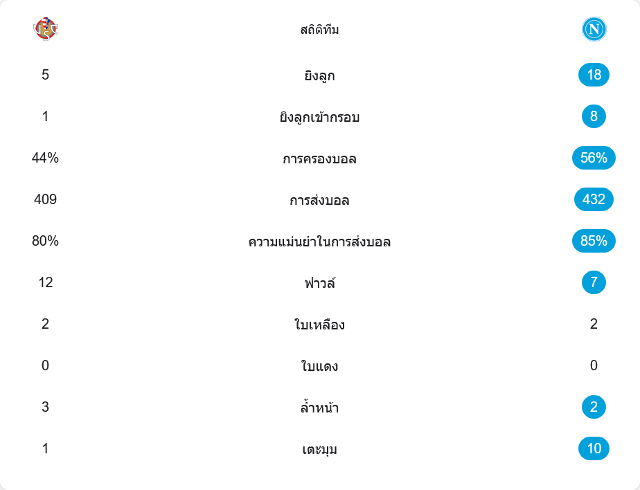 ตัวเลขหลังเกมสะท้อนภาพในสนามแบบชัดเจน นาโปลีครองบอล 56% เหนือกว่าเจ้าบ้านที่มีเพียง 44% ทีมเยือนสร้างโอกาสยิงได้ถึง 18 ครั้ง เข้ากรอบ 8 ครั้ง ขณะที่เครโมเนเซ่มีโอกาสยิงเพียง 5 ครั้ง เข้ากรอบแค่ลูกเดียว การผ่านบอลของนาโปลีอยู่ที่ 432 ครั้ง ความแม่นยำสูงถึง 85% ส่วนเจ้าถิ่นผ่านบอล 409 ครั้ง ความแม่นยำ 80% แสดงให้เห็นความนิ่งและคุณภาพการคุมบอลของทีมเยือนอย่างชัดเจน