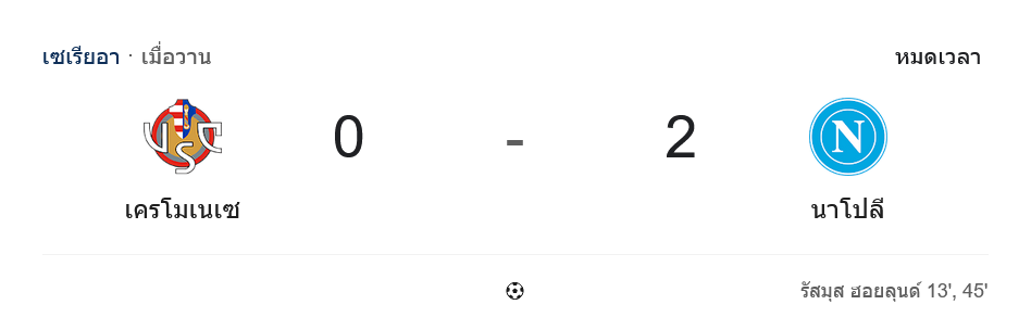 - ⚽ 13′ ราสมุส ฮอยลุนด์ ซัดประตูให้ นาโปลี บุกนำ 1-0
