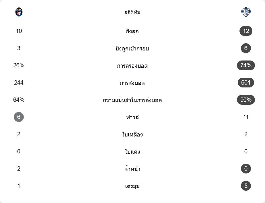 จำนวนการส่งบอลยิ่งต่างกันชัด ปิซ่าส่งบอล 244 ครั้ง ความแม่นยำ 64% ส่วนโคโมต่อบอลถึง 601 ครั้ง และแม่นยำสูงถึง 90% แปลว่าทีมของฟาเบรกาสคุมจังหวะเกมไว้ในกำมือแบบเบ็ดเสร็จ แม้ฟาวล์ของโคโมจะมากกว่า (11 ต่อ 6) แต่ก็เป็นการตัดเกมในจังหวะจำเป็น ขณะที่ลูกเตะมุมทีมเยือนก็เหนือกว่าชัด 5 ต่อ 1 ตอกย้ำภาพทีมที่บุกกดดันอย่างต่อเนื่องตลอดเกม